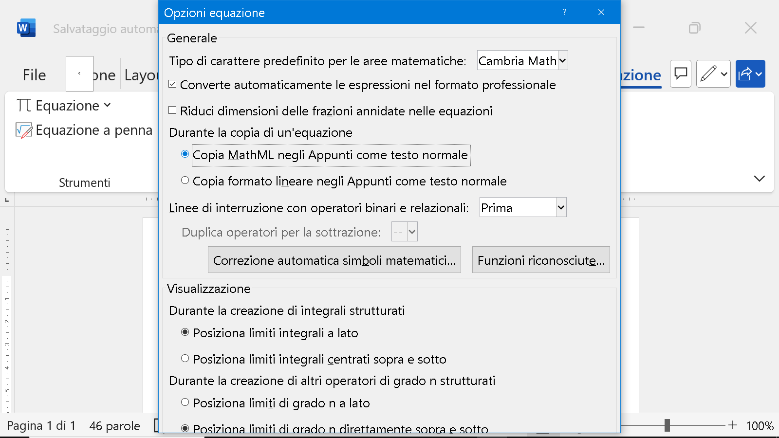 Questa configurazione è necessaria solo una volta, ma è utile verificarla quando ci si appresta ad eseguire queste operazioni, per garantire che Word sia pronto per copiare le formule nel formato corretto.